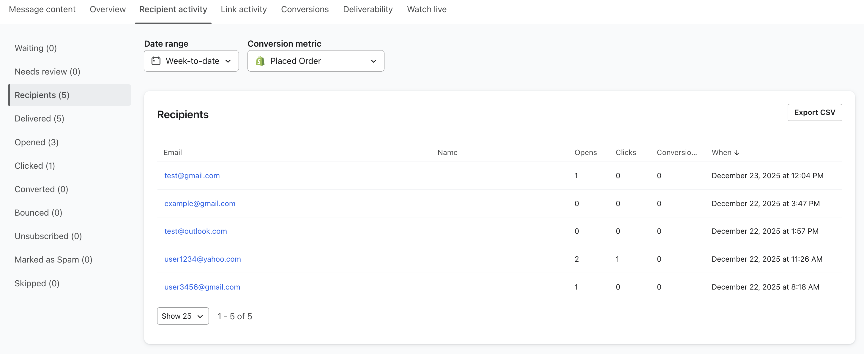 Die Registerkarte Empfängeraktivität enthält Daten darüber, wie die Menschen mit deiner Flow Message interagieren. Du kannst die Daten sortieren, um ganz einfach eine bestimmte E-Mail-Adresse/Telefonnummer zu finden oder zu sehen, wer deine E-Mail am häufigsten geöffnet/geklickt hat. Diese Empfängerdaten können exportiert werden, indem du auf die Schaltfläche CSV exportieren klickst.