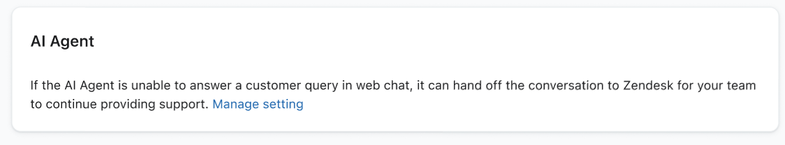 - Wenn du Klaviyo Customer Hub und Klaviyo AI Agent benutzt: Du kannst Kundenanfragen, die der KI-Service-Agent nicht beantworten kann, an dein Team in Zendesk weiterleiten. Klick auf „Einstellungen verwalten“, um zu den Einstellungen für den Klaviyo AI-Agenten zu gelangen, und wähl Zendesk als Agentenübergabe aus.