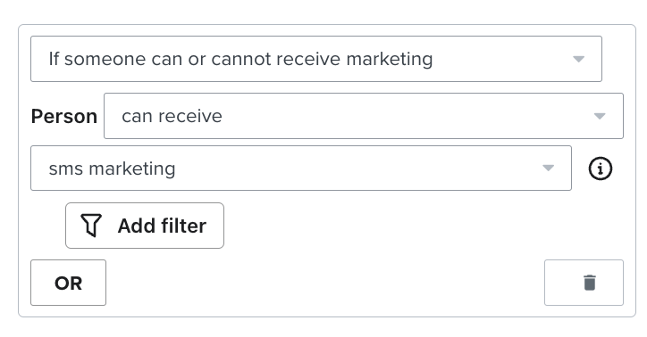 - Setze die Bedingung für den Split auf: Wenn jemand Marketing erhalten kann oder nicht > kann > SMS-Marketing erhalten.
