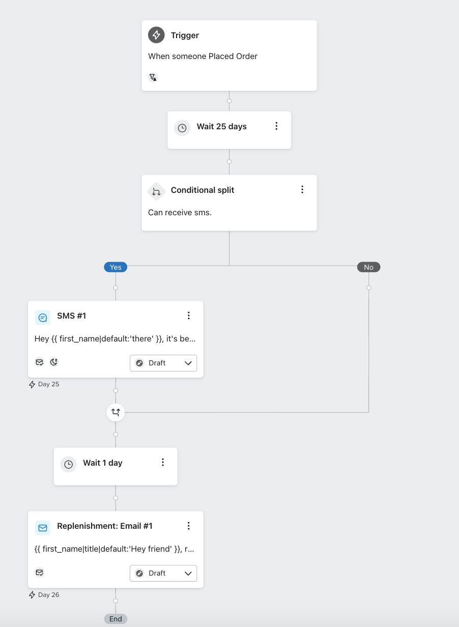 Das passt gut zum Replenishment Flow, der (wenn du das richtige Timing erwischst) eher als willkommene Erinnerung denn als aufdringliche, verkaufsorientierte Botschaft gesehen wird. Wenn du SMS zu deinem Replenishment Flow hinzufügst, kannst du deine Kunden genau dann daran erinnern, ihre Vorräte aufzufüllen, wenn sie es brauchen.