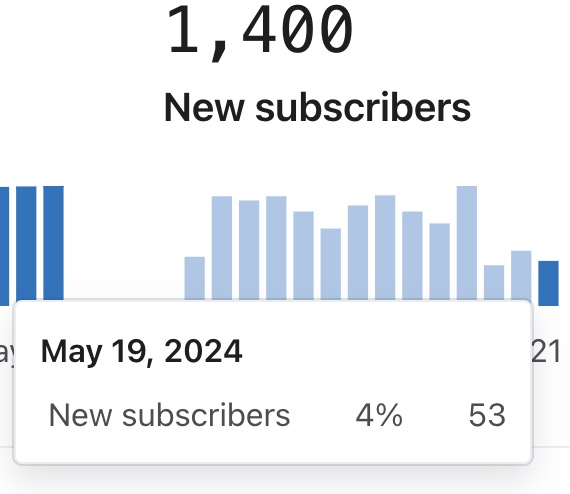 Die Zahl oben rechts gibt die Gesamtzahl der neuen SMS Abonnenten an, die in dem von dir gewählten Zeitraum gewonnen wurden. Wenn du mit dem Mauszeiger über einen der Balken im Diagramm fährst, kannst du außerdem sehen, wie viele neue Abonnenten zu diesem Zeitpunkt hinzugekommen sind (sowohl als Prozentsatz als auch als Gesamtsumme der Gesamtzahl der neuen Abonnenten).