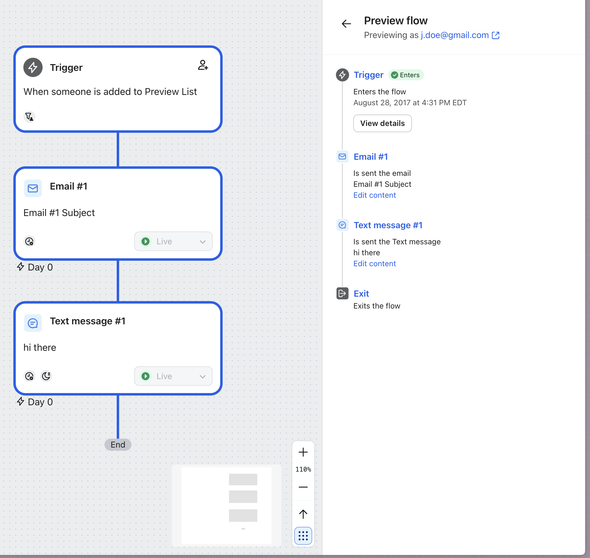 - Die Vorschau prüft den Abonnementstatus nicht. Wenn der Status eines Profils "abgemeldet" ist, zeigt die Vorschau trotzdem an, wie sie sich durch den Flow bewegen, als ob sie sich neu angemeldet hätten.