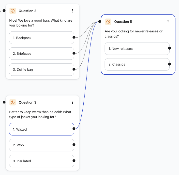 - Nachdem du eine Frage hinzugefügt hast, kannst du eine weitere Karte hinzufügen, die sich von der Auswahl einer Frage verzweigt. Der verzweigte Pfad kann eine Frage, Nachricht oder Empfehlung sein.
