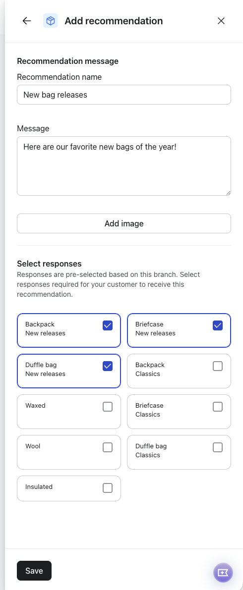 - Wähle nach deinen Fragen die Schaltfläche mit dem Pluszeichen (+) und klicke dann auf Empfehlung hinzufügen oder Nachricht hinzufügen , um die Automatisierung abzuschließen.