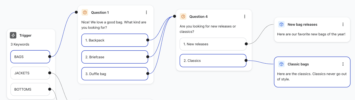- Füge zum Beispiel die gleiche Frage oder Nachricht aus allen Schlüsselworten hinzu: oder eine einzige Nachricht, wenn jemand mit „Taschen“, „Jacken“ oder „Unterteile“ antwortet