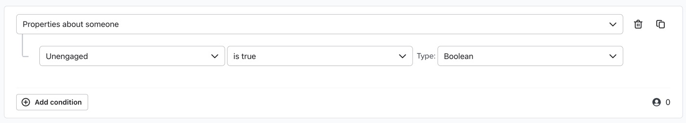 - Konfiguriere den Tag, um festzulegen, dass diese Kontakte unterdrückt werden sollen. Du kannst dies tun, indem du eine neue boolesche Profileigenschaft erstellst, bei der der Wert "Unengaged" " True ist."