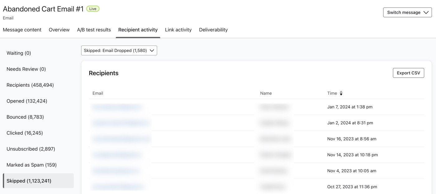 - Klicke auf die Registerkarte Empfängeraktivität, um alle Profile anzuzeigen, die diesen Schritt durchlaufen haben. Du kannst die Profile sehen, die darauf warten, durchzugehen, die Empfänger, die erfolgreich durchgegangen sind, und die Profile, die diesen Schritt übersprungen haben.