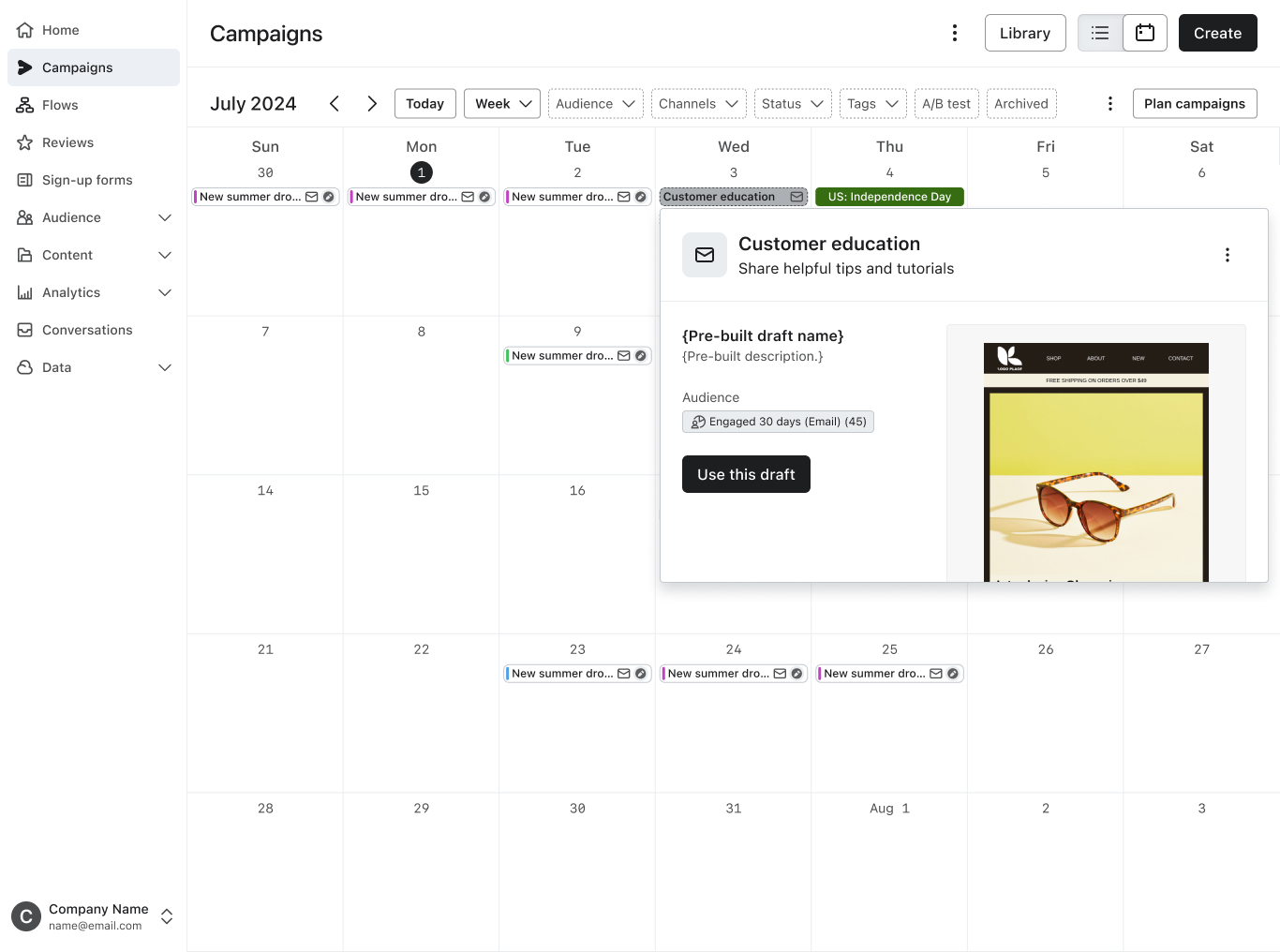 Erfahre, wie du mit dem Kampagnenplaner von Klaviyoein persönliches Kampagnen-Abonnement erstellen kannst. Der Kampagne-Planer füllt deinen Kampagne-Kalender mit Platzhaltern, nachdem du Informationen über deine Marke angegeben hast.