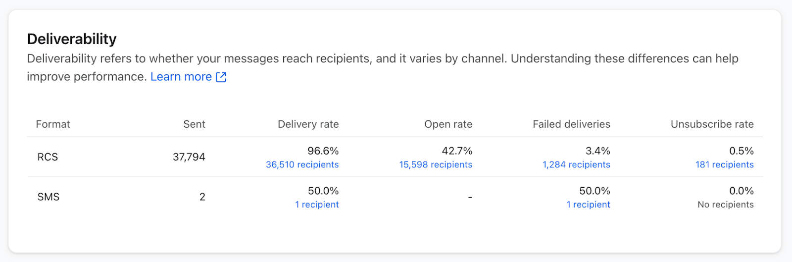 - Nur RCS: Öffnungen sind nicht für SMS oder MMS verfügbar. Die Öffnungsrate in den aggregierten Berichten gilt nur für RCS.
