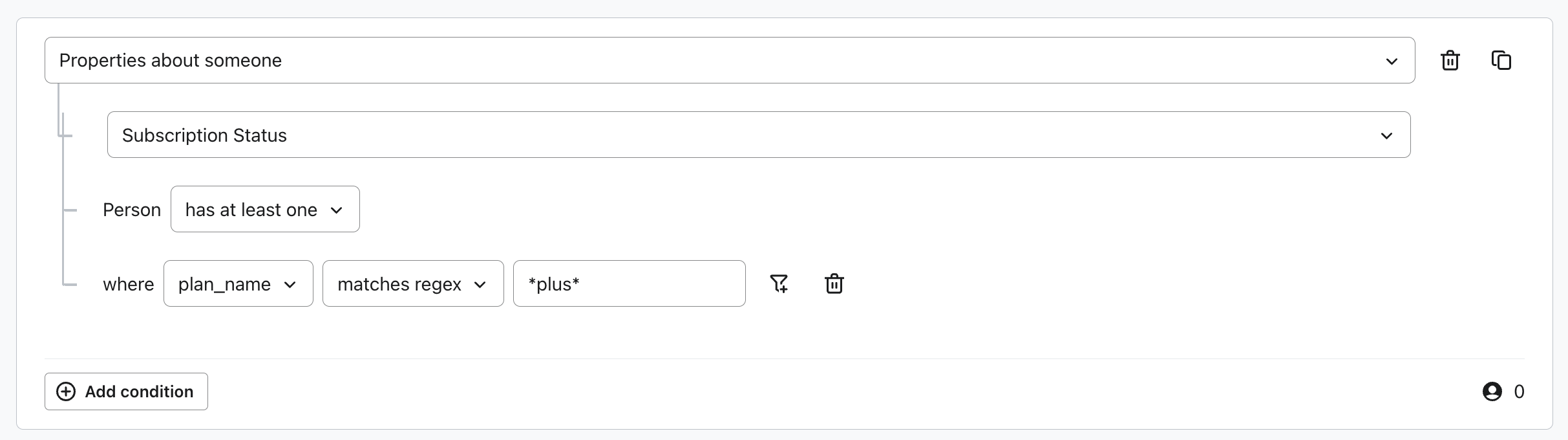 Mit Regex Matching kannst du Profile nach Textmustern statt nach genauen Werten filtern. Dies ist nützlich, um Profile zu finden, die einem bestimmten Format entsprechen, z. B. E-Mail-Adressen von bestimmten Domains oder Telefonnummern in einem bestimmten Format.