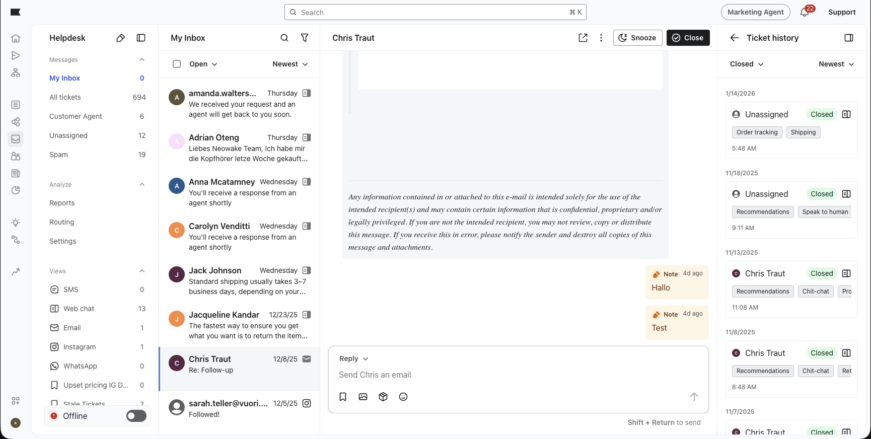 KI-gestützte Tags: Um Zeit zu sparen, analysiert unsere KI automatisch den Inhalt früherer Interaktionen und wendet beschreibende Tags an, z. B. Versand, Bestell-Tracking, Empfehlungen oder Rückerstattung. Mit diesen Tags können Service-Mitarbeiter*innen auf einen Blick sehen, worum es bei einem Ticket ging, ohne alte Threads durchlesen zu müssen.