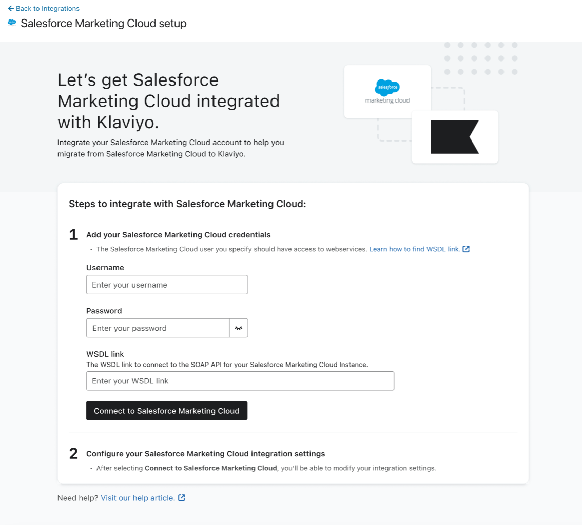 Learn how to integrate Salesforce Marketing Cloud (previously ExactTarget) with Klaviyo. This integration is designed to help you move from Salesforce Marketing Cloud to Klaviyo. We don't recommend using both platforms at once other than during the interim period as you make the switch.