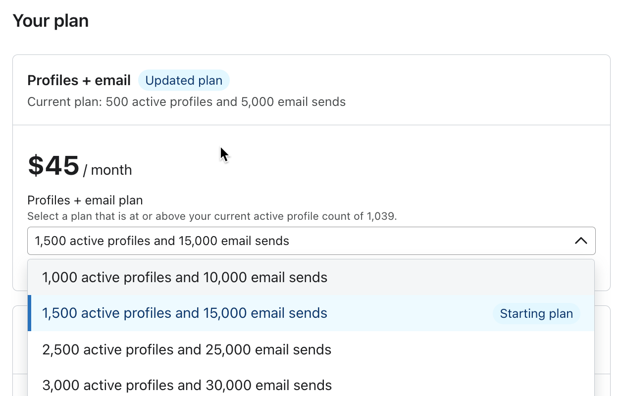 Klaviyo automatically upgrades your plan based on profiles for the Profiles & Email plan as well as Marketing Analytics and Customer Hub plans. This is also known as Profile Enforcement.