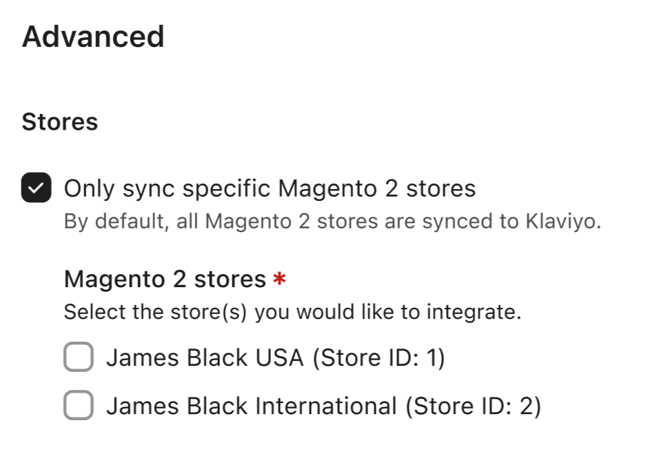 If you're interested in creating separate Klaviyo accounts for each of your Magento 2 stores, click the advanced option on the Magento 2 integration page to retrieve a list of your stores, and select the stores you want to sync to the Klaviyo account you're working with. -