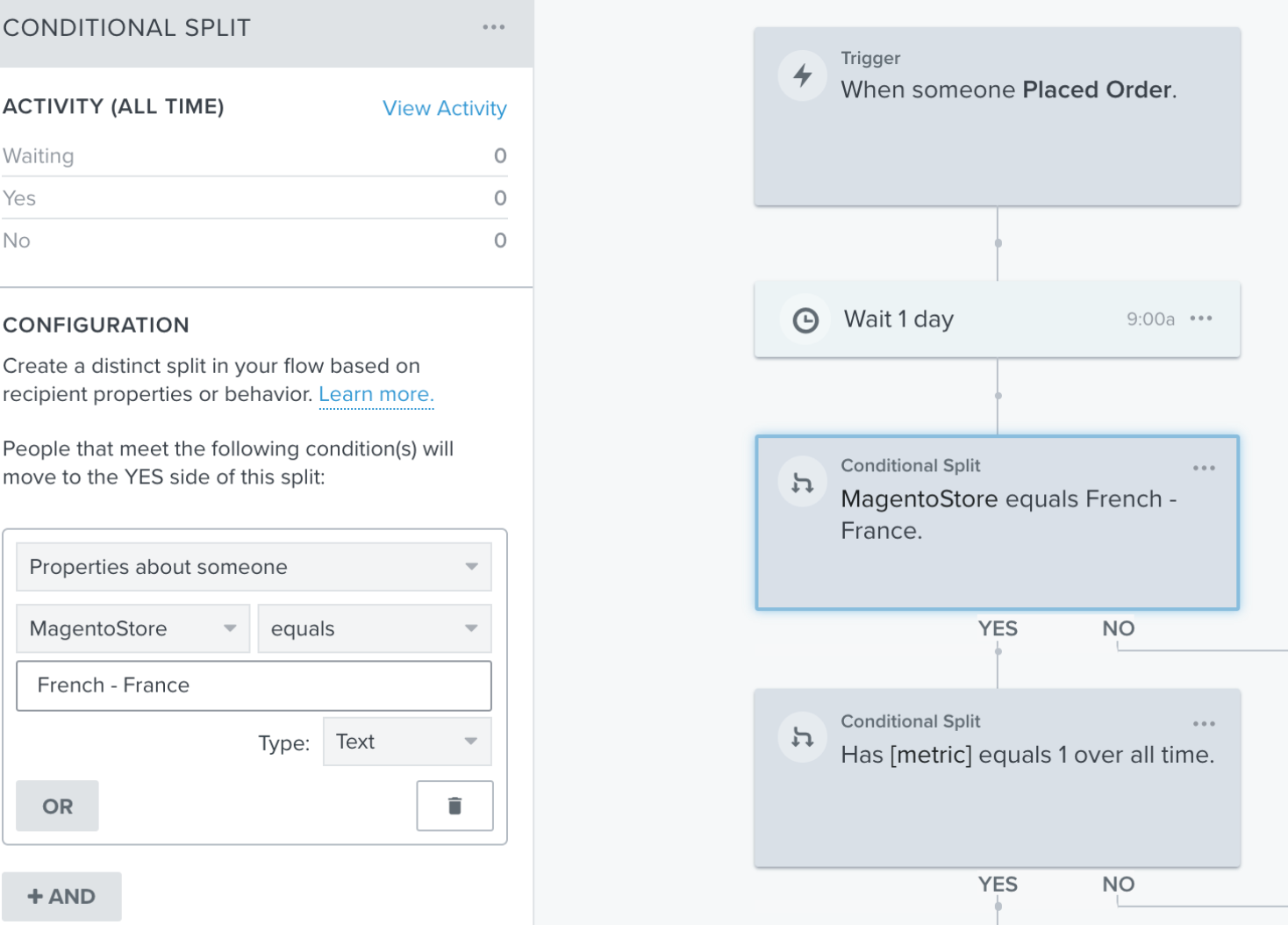You may want to set up different messaging for multiple Magento stores. For example, if you support multiple languages in your Magento stores, you may want to create a post purchase flow and with different flow branches for your French-speaking stores and for your English speaking stores. You can accomplish this by creating a conditional split based on the MagentoStore profile property.