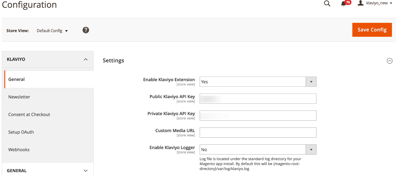 - Create a webhook secret and enter it into the corresponding Webhook Secret field. The webhook secret is a key that Klaviyo will use for validation. This secret can be anything you choose, but we recommend creating a secure string of letters and numbers. Magento will hide your webhook secret with asterisks for security purposes, so be careful to enter it correctly.