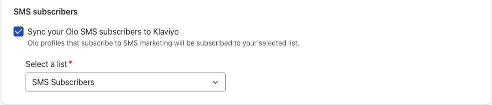 - Check the setting to sync Olo SMS subscribers to Klaviyo. Then, select your main SMS list (or another list, if desired) from the dropdown.
