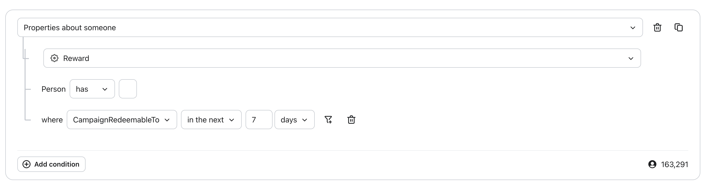 For example, using objects, you can create a segment of guests who have a reward that expires in the next 7 days: