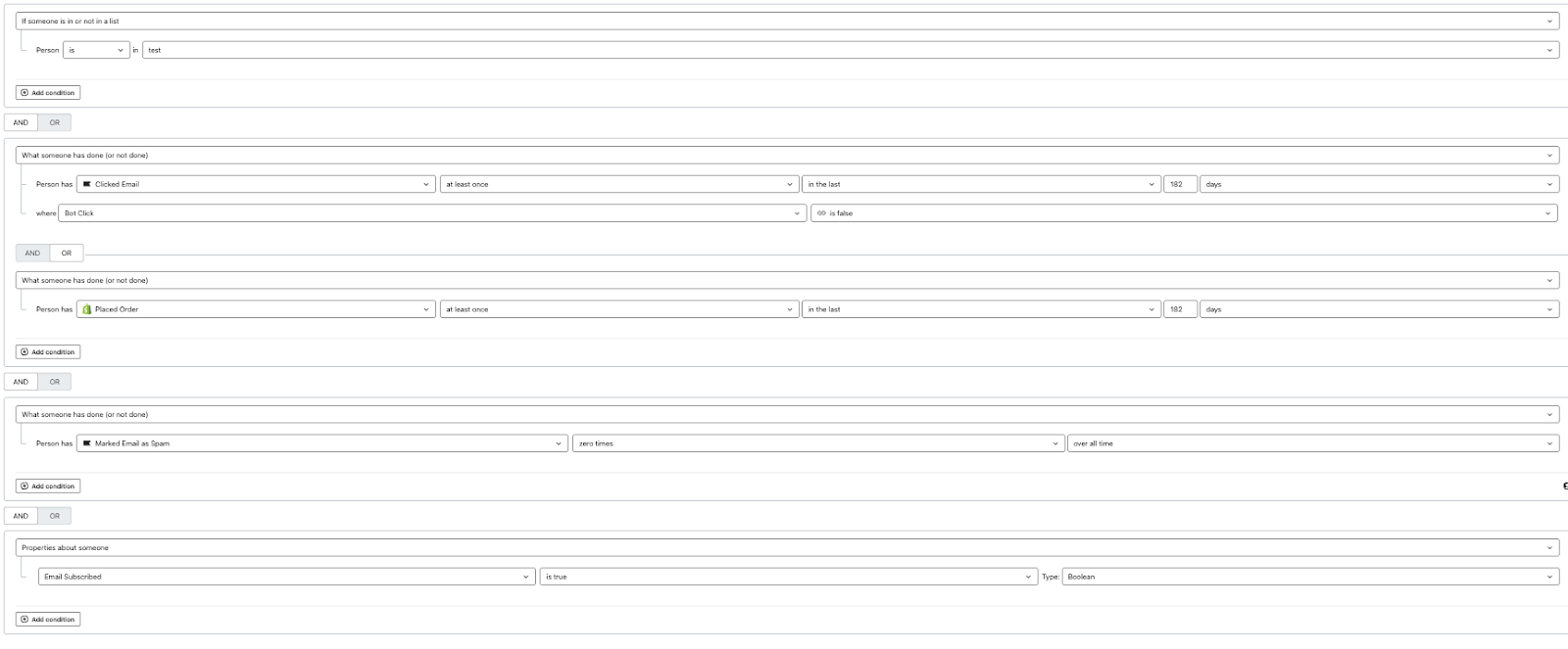 - AND the profile has a human verified email click (non-bot) OR purchase within the last last 6 months