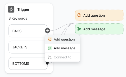 - For example, adding the same question or message from all keywords: or a single message if someone replies with "Bags" "Jackets" or "Bottoms"