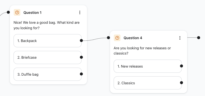 - For example, asking a new set of questions, or sending a single message, if someone replies with "Bags" "Jackets" or "Bottoms"