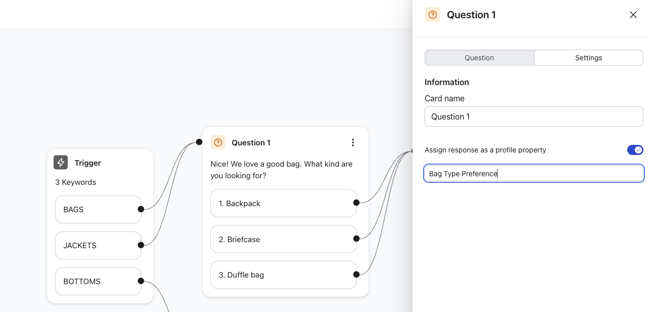 - For the example below, the response "Backpack" can be saved as a new custom profile property for "Bag Type Preference."
