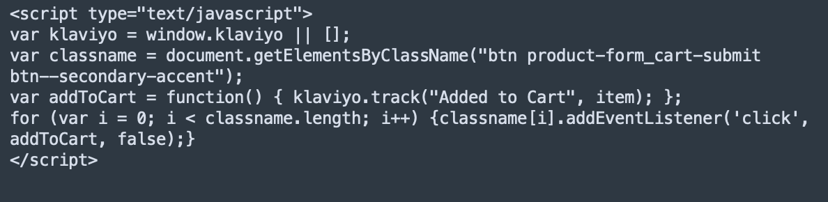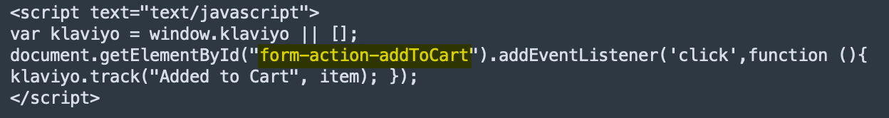 <script text="text/javascript"> //Initialize Klaviyo object immediately on page load !function(){if(!window.klaviyo){window._klOnsite=window._klOnsite||[];try{window.klaviyo=new Proxy({},{get:function(n,i){return"push"===i?function(){var n;(n=window._klOnsite).push.apply(n,arguments)}:function(){for(var n=arguments.length,o=new Array(n),w=0;w<n;w++)o[w]=arguments[w];var t="function"==typeof o[o.length-1]?o.pop():void 0,e=new Promise((function(n){window._klOnsite.push([i].concat(o,[function(i){t&&t(i),n(i)}]))}));return e}}})}catch(n){window.klaviyo=window.klaviyo||[],window.klaviyo.push=function(){var n;(n=window._klOnsite).push.apply(n,arguments)}}}}(); </script> <script text="text/javascript"> //Added to Cart var klaviyo = window.klaviyo || []; document.getElementById("form-action-addToCart").addEventListener('click',function (){ klaviyo.track("Added to Cart", item); }); </script> - Next, check if you need to modify your snippet. To do this, you’ll need to check the ID of the “Add to Cart” button on your site, and see if it matches the “Add to Cart” variable highlighted in the snippet below, whose default is