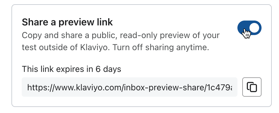 - Once the inbox test is complete, toggle on the Share a preview link setting.