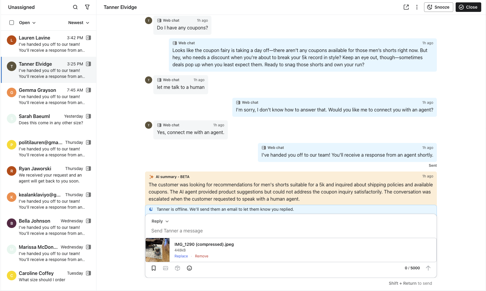 Agents can now share media directly with customers on Email, Webchat, Instagram, SMS, and WhatsApp.