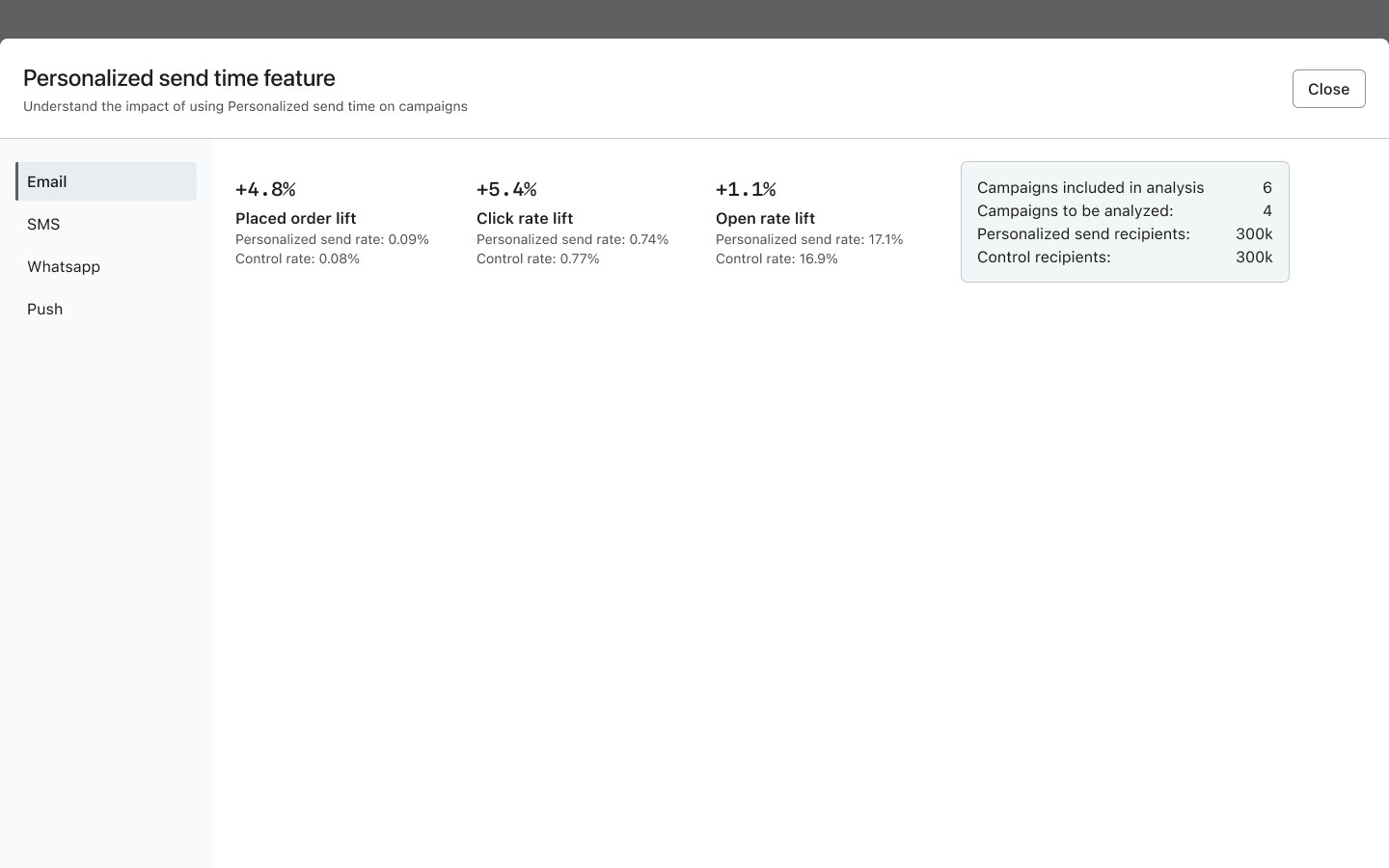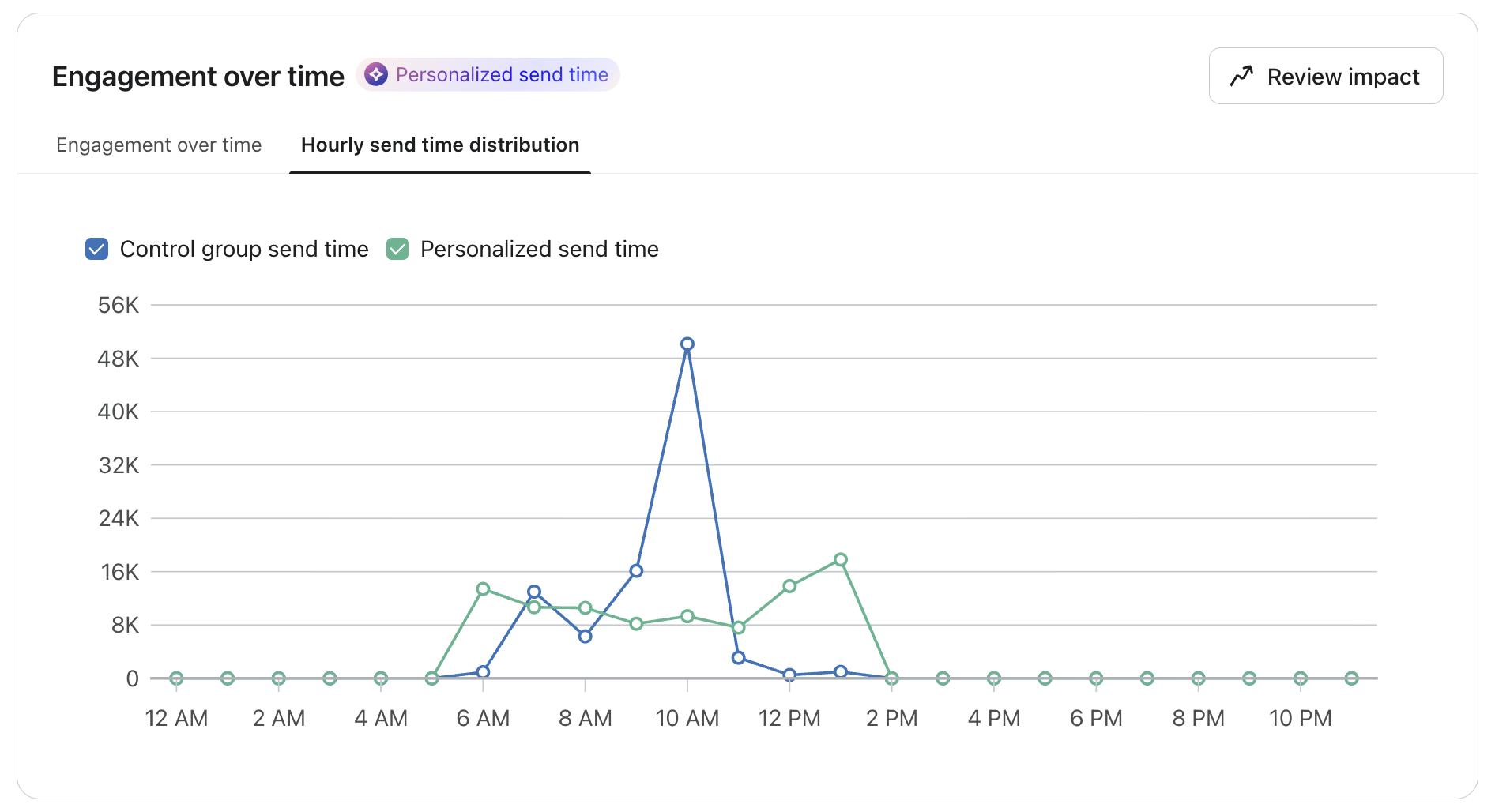 - For each campaign that uses Personalized Send Time, a randomly selected portion of eligible recipients is automatically held out in a control group. These recipients receive the same campaign on a non-personalized schedule that follows your recent send-time distribution within the window you chose (that is, how you typically send today for that channel).