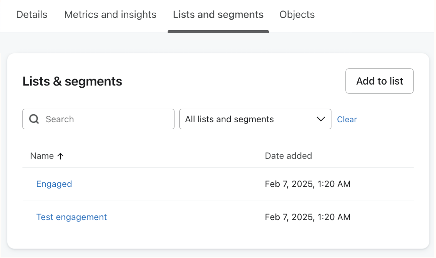 La pestaña lista y segmento muestra todas las listas y segmentos a los que pertenece alguien.