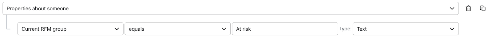Una vez hecho esto, los 2 primeros pasos de tu segmento deben parecerse a los siguientes e incluir a cualquiera que esté en tus grupos Necesita Atención o En Riesgo. - Opcional: Los grupos En Riesgo y Necesita Atención pueden incluir a quienes hayan realizado al menos una compra en el pasado. Sin embargo, si quieres dirigirte a clientes que han comprado un determinado número de veces en el pasado (por ejemplo, sólo compradores únicos), pero que ahora están en los grupos En riesgo o Necesita atención, puedes utilizar la condición +Añadir para añadir un conector Y.