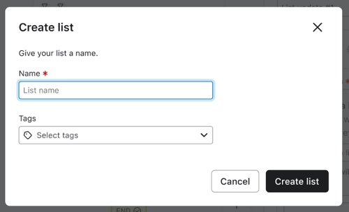 - Para crear una nueva lista. Elige un nombre y una etiqueta para la lista. Una vez que hayas creado la nueva lista, se seleccionará en la barra lateral.