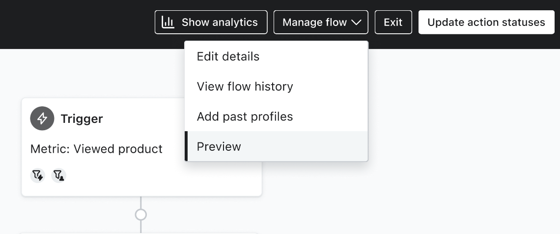 - En la parte superior derecha del constructor de flujo, haz clic en Gestionar flujo > Vista previa.