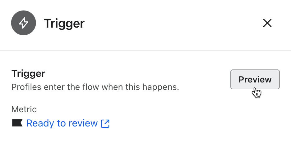 Actualmente, la herramienta de previsualización de la configuración del activador de flujo sólo está disponible para: lista, segmento o flujo activado por métrica. Esta función no está disponible para el flujo de fecha propiedad, inventario bajo o bajada de precio.