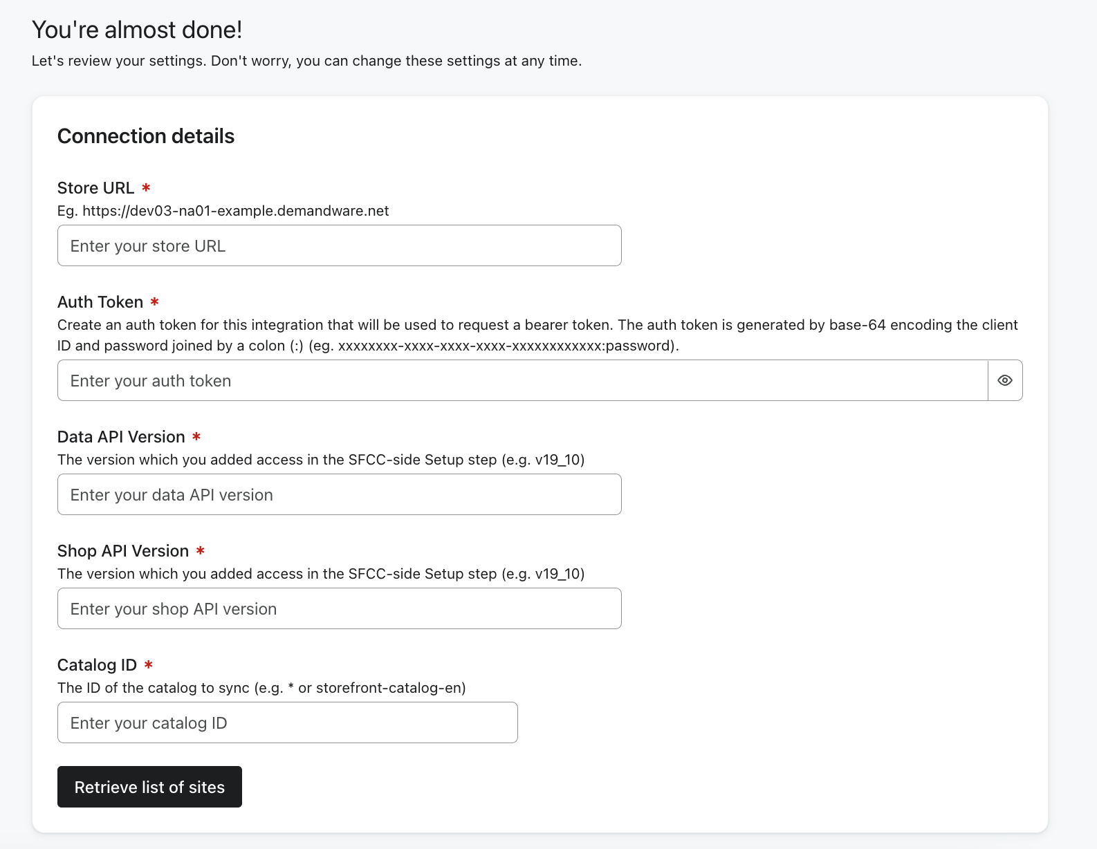 - Una vez introducidas estas credenciales, haga clic en el enlace Recuperar lista de sitios para recuperar una lista de sitios en su instancia SFCC.