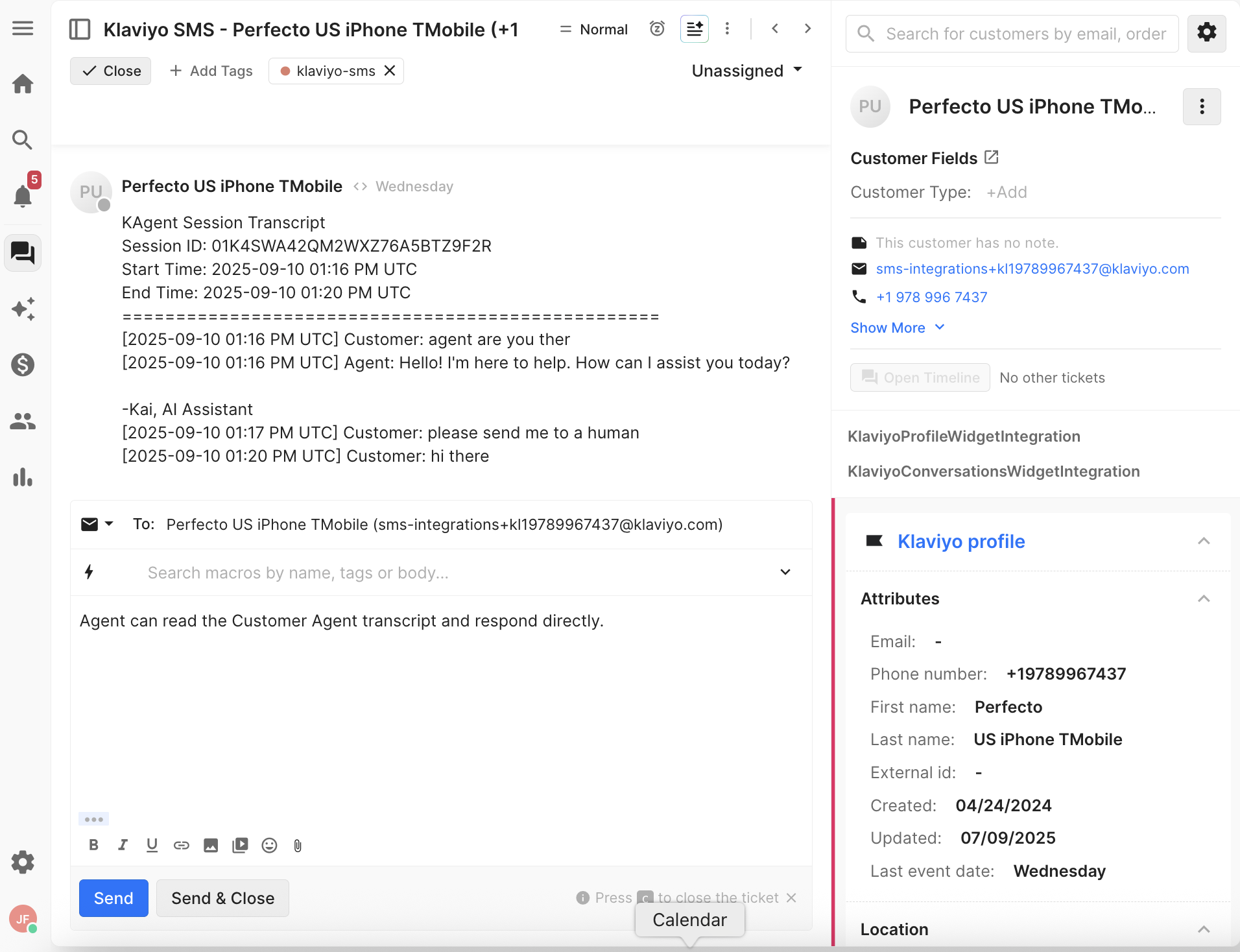 - Customer Agent crea un ticket y que incluye la transcripción completa de la conversación con marcas de tiempo, la dirección de correo electrónico del visitante y su ID de perfil de Klaviyo (si existe).