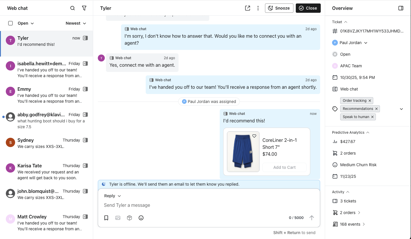 En este artículo, aprenderás cómo tu equipo de asistencia puede buscar productos y enviar recomendaciones vinculadas directamente desde el ticket. Al dar a tu equipo de asistencia acceso fácil a sugerencias de productos con un solo clic, Helpdesk permite que tu equipo de asistencia crezca más allá de solo resolver problemas y avance hacia proporcionar una experiencia de conserjería para tus clientes más propensos a comprar y que se comuniquen.