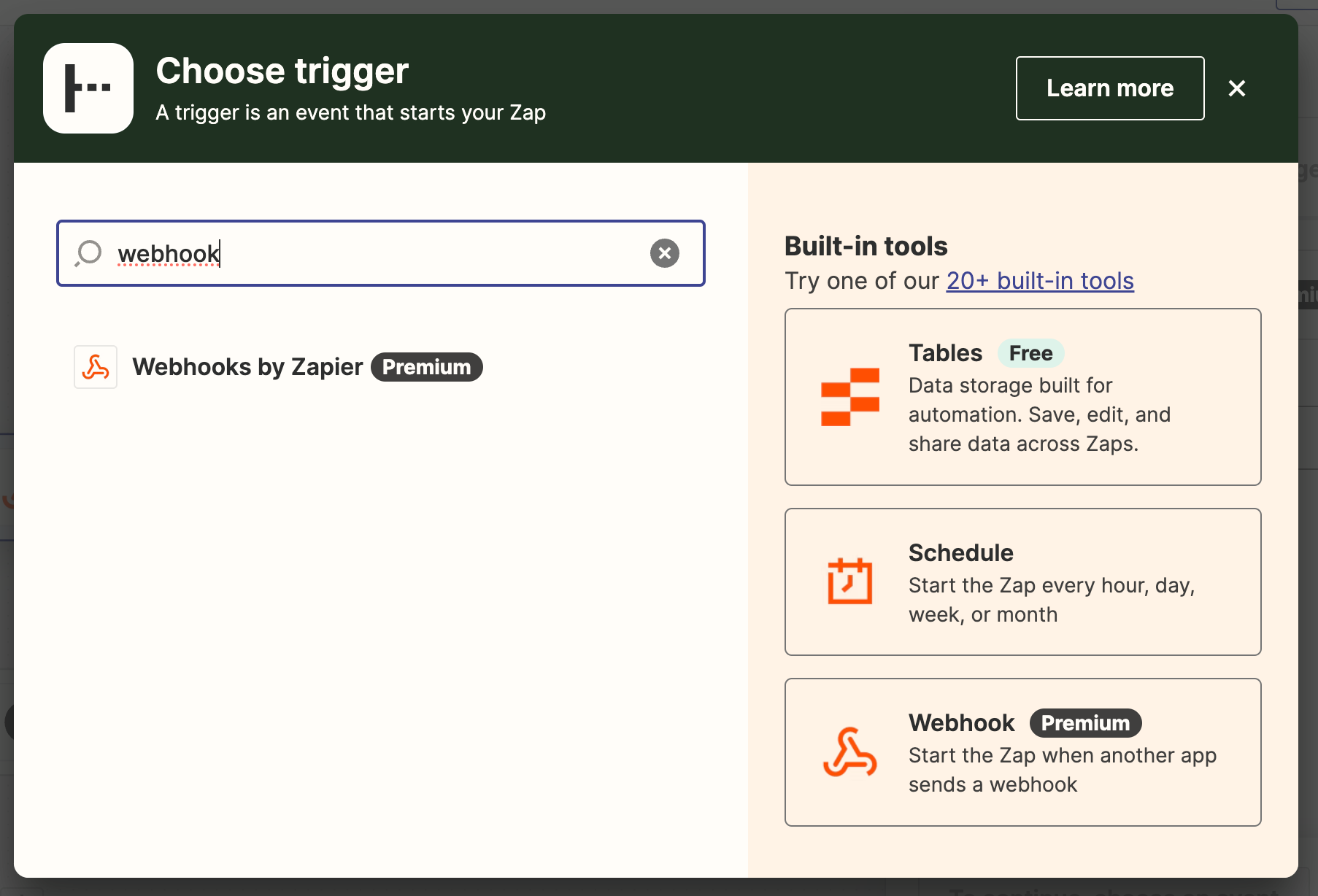 - Busque Webhook y, a continuación, seleccione Webhooks by Zapier en el menú Trigger.