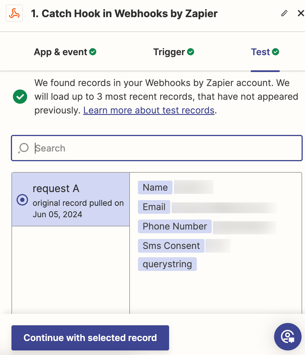 - Antes de realizar la prueba, deberá enviar datos de prueba a su webhook. Consulte nuestra guía sobre Cómo enviar datos de prueba a Zapier para obtener más información. Asegúrese de formatear correctamente los números de teléfono al enviar los datos de prueba.