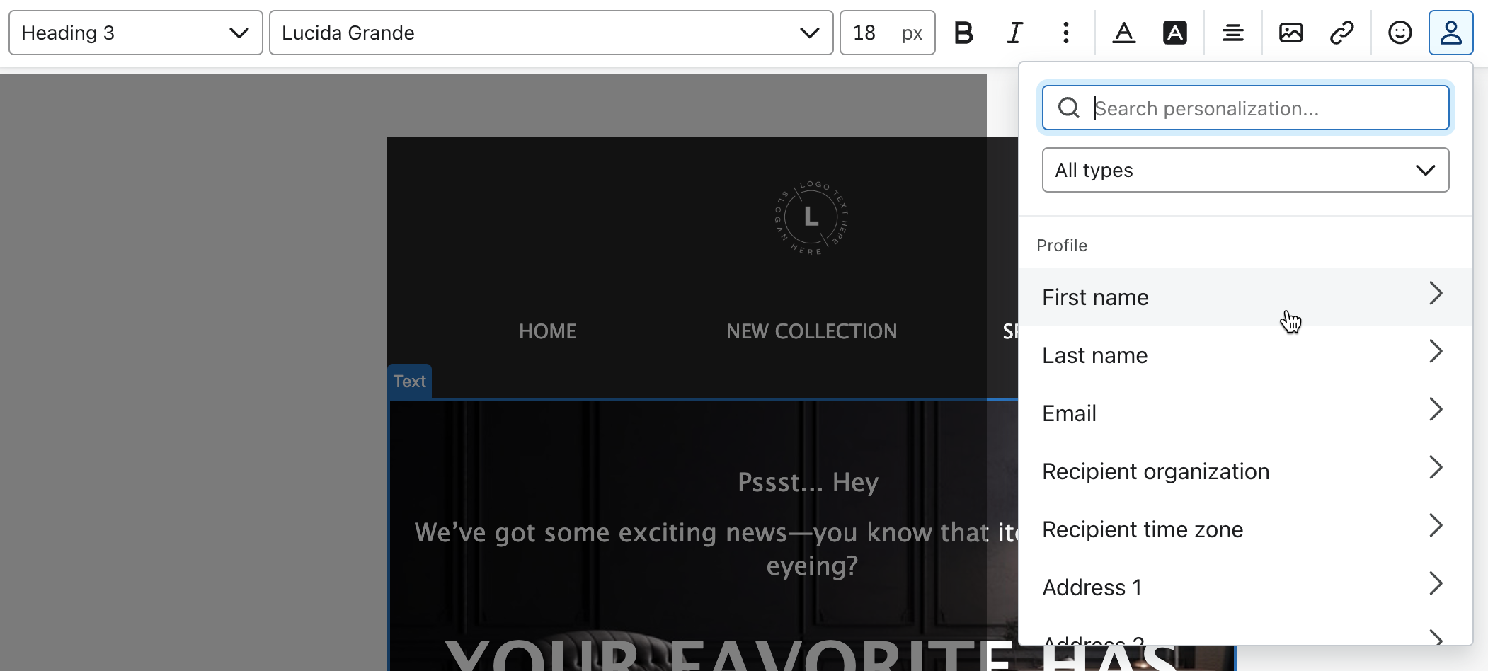 Puedes añadir estas etiquetas a tu plantilla escribiéndolas directamente en un campo de texto, copiándolas desde el modal de vista previa del correo electrónico, o utilizando el menú de personalización en un bloque de texto.