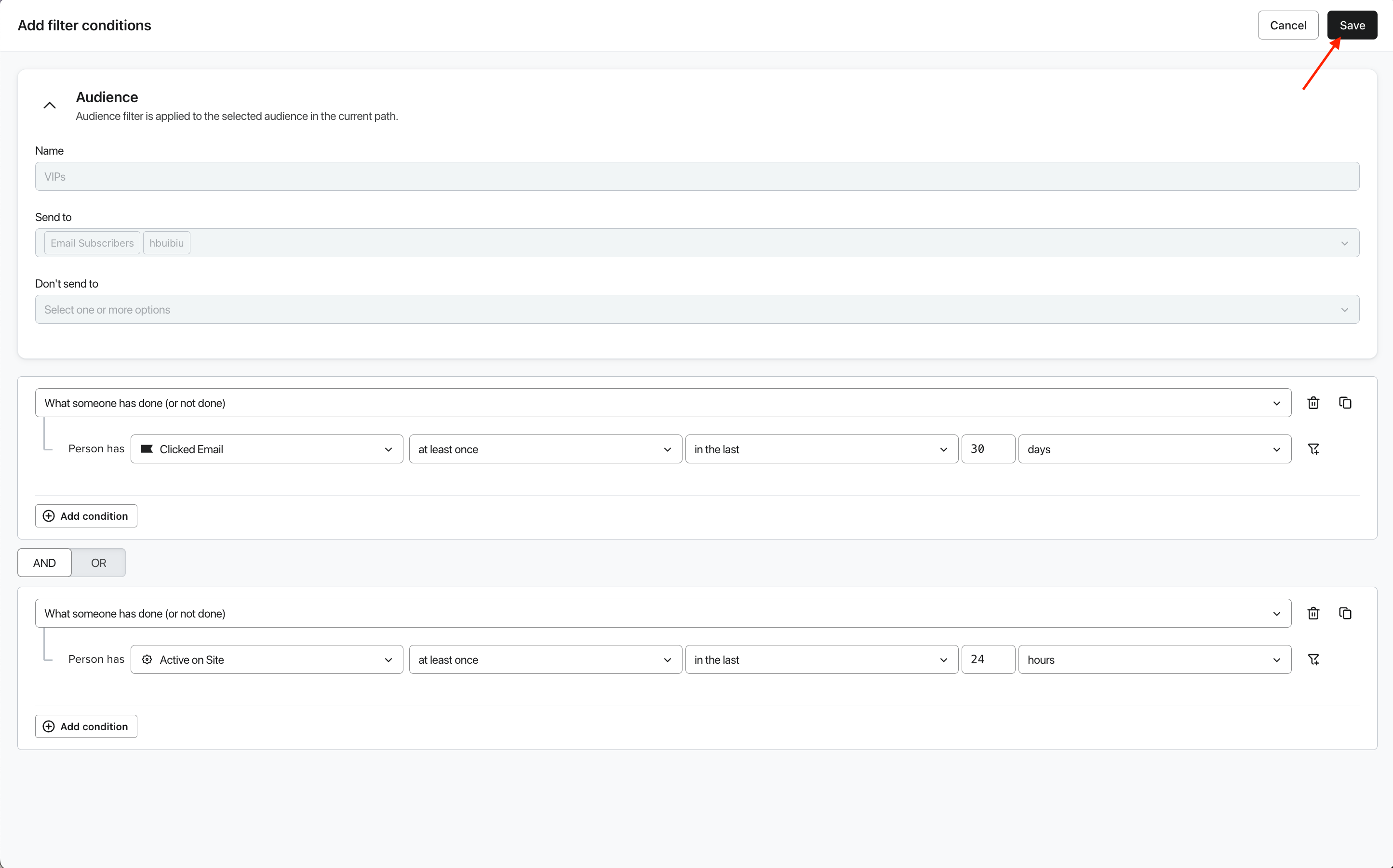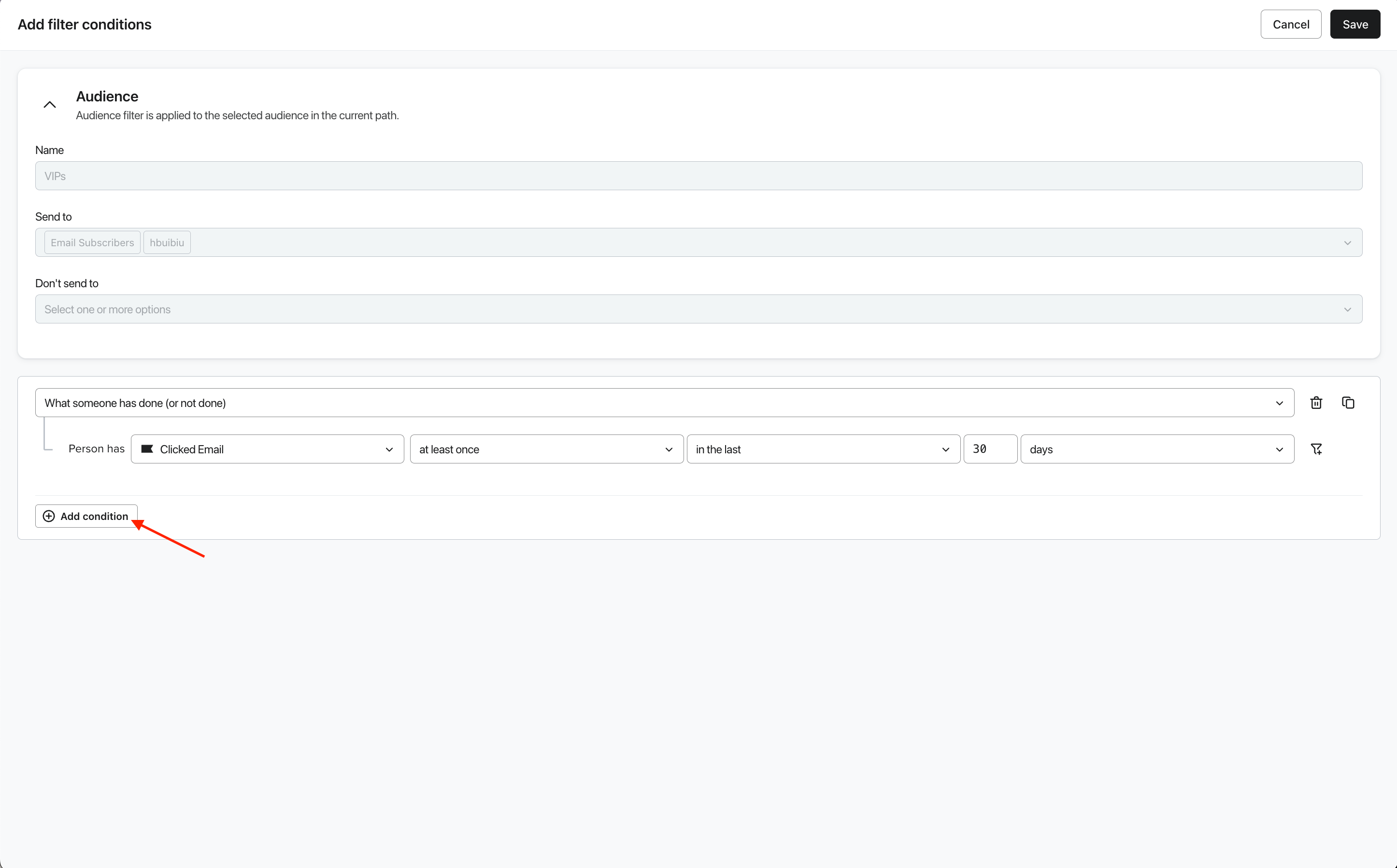 - En la sección Filtro de audiencia, haz clic en Añadir condiciones de filtro.