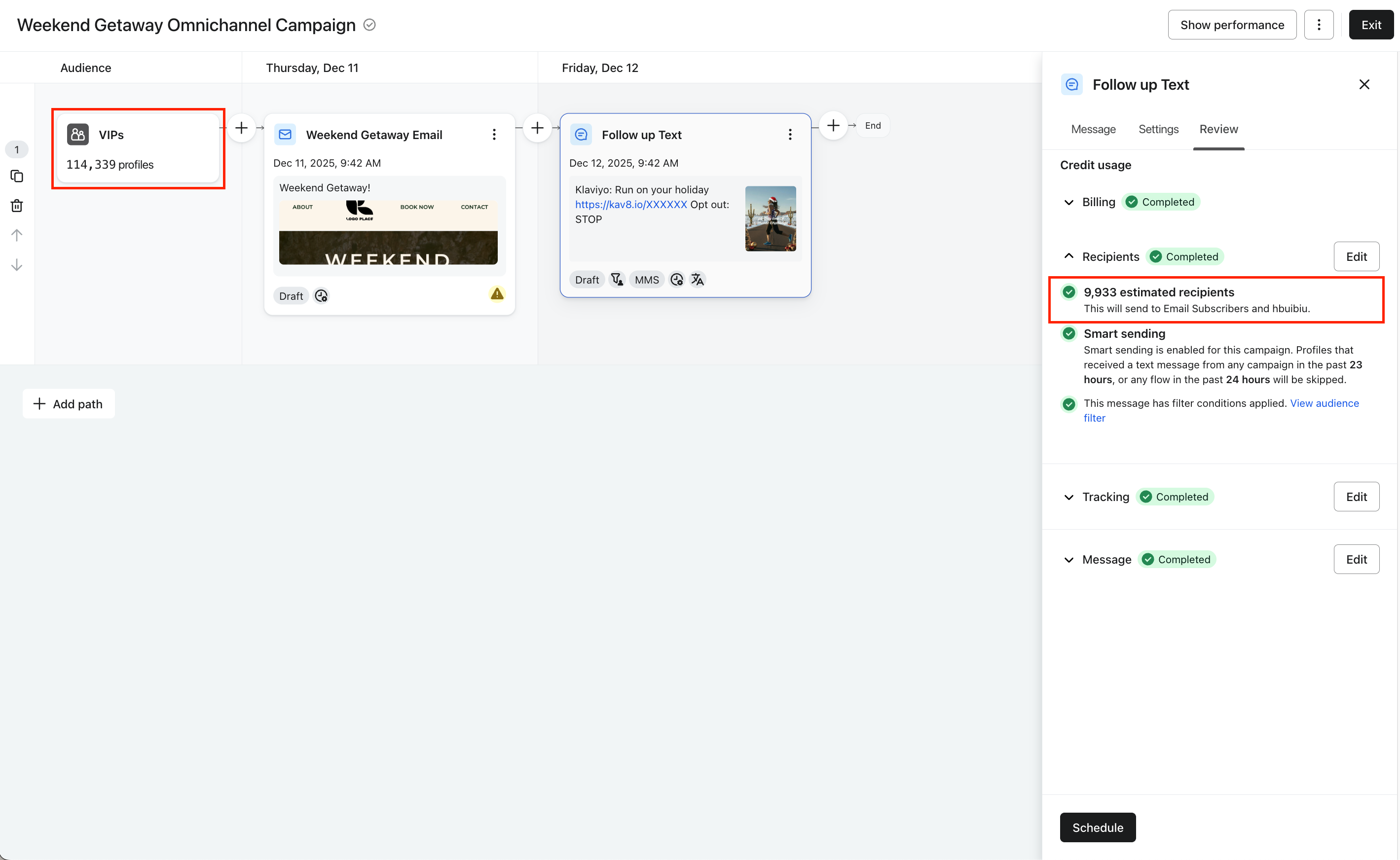 - Para confirmar el impacto del filtro, haz clic en la pestaña Revisar y comprueba los destinatarios estimados. Este número actualizado refleja el subconjunto de audiencias que cumple los criterios de filtro.