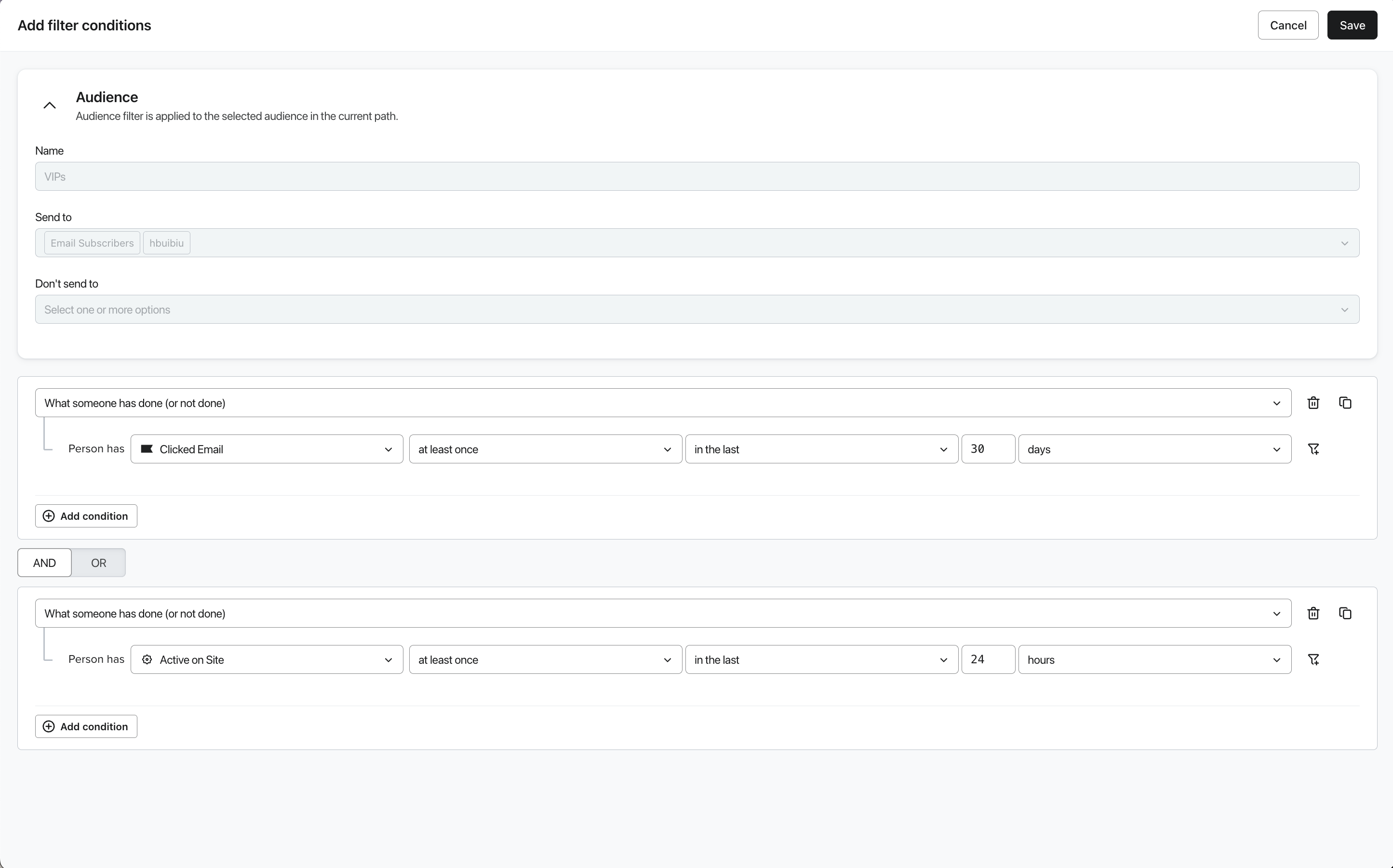 - A continuación, define tus condiciones de filtro. Ten en cuenta que la audiencia que se muestra en la parte superior es la audiencia general de nivel superior; las condiciones que añadas reducirán este grupo a un subconjunto más pequeño y específico.