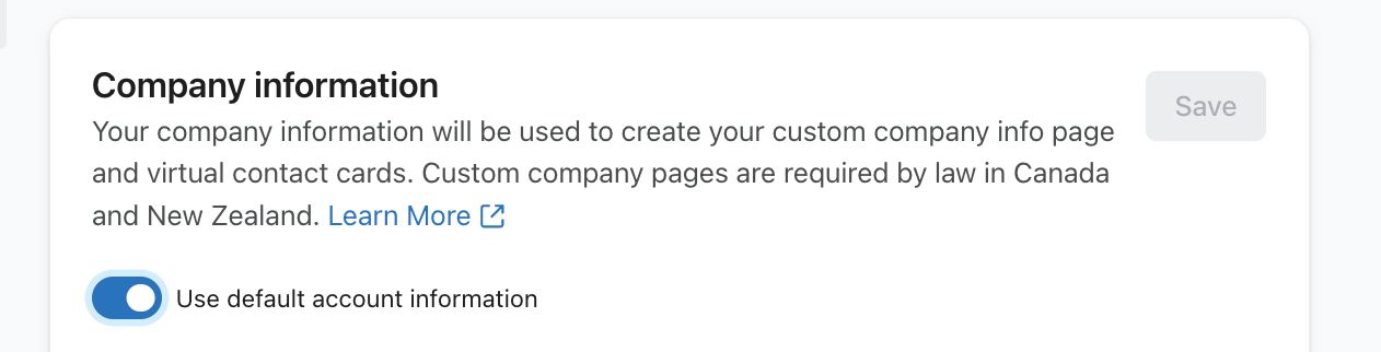- Desplázate hasta la sección Información de la empresa. Se rellenará automáticamente con la información de tu empresa proporcionada para tu cuenta, pero puedes editar la información específica para la tarjeta de contacto. Para ello, desactiva la activación/desactivación Utilizar la información de cuenta por defecto.