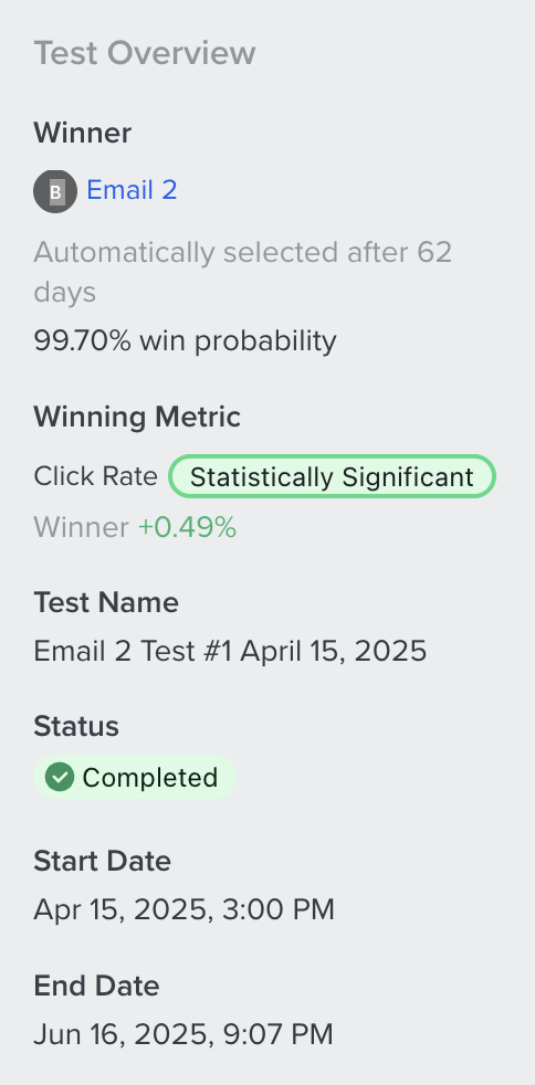 La significación estadística se da cuando Klaviyo es capaz de determinar matemáticamente si una variante producirá una mejora del rendimiento. Puedes configurar una prueba A/B de flujo para que elija automáticamente una variante ganadora una vez que los resultados de la prueba se consideren estadísticamente significativos.