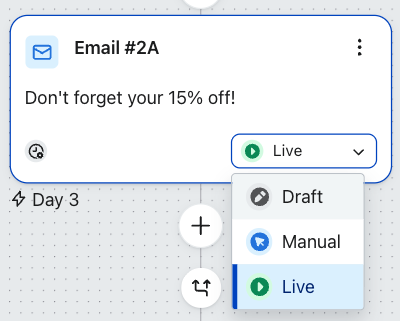- De lo contrario, si solo una parte de tu flujo está lista, puedes actualizar el estado de las acciones individuales haciendo clic en el botón de estado situado en la parte inferior de cada acción del flujo, como se muestra a continuación.