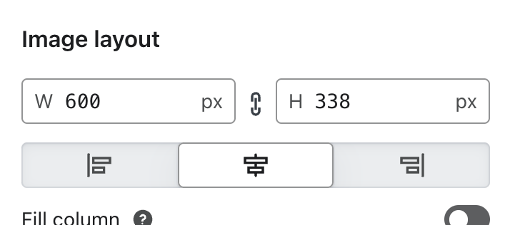- Añade un número al campo Diseño de imagen > W. Para las imágenes de ancho completo, utiliza 600 px (o el ancho que esté configurado en tu correo electrónico, que se encuentra en la sección Estilos ).