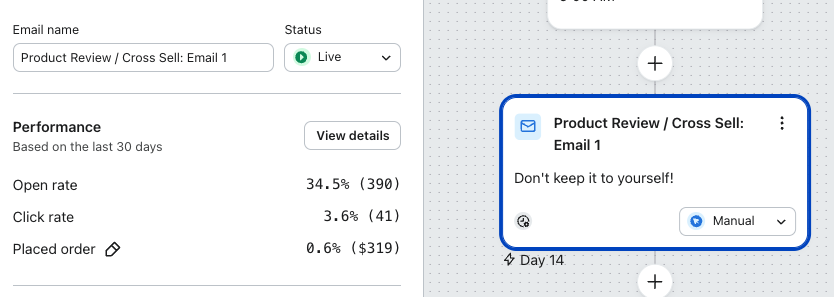 Cuando migres a las plataformas ecommerce, asegúrate de cambiar la métrica utilizada para tu flujo y análisis a la métrica de tu nueva plataforma ecommerce. Por ejemplo, si cambiaras de BigCommerce a Shopify, es posible que el análisis y el flujo de tu cuenta siguieran configurados para utilizar BigCommerce's Placed Order métrica en lugar de Shopify's Placed Order métrica. Consulta nuestra guía sobre cómo cambiar un activador de flujo.