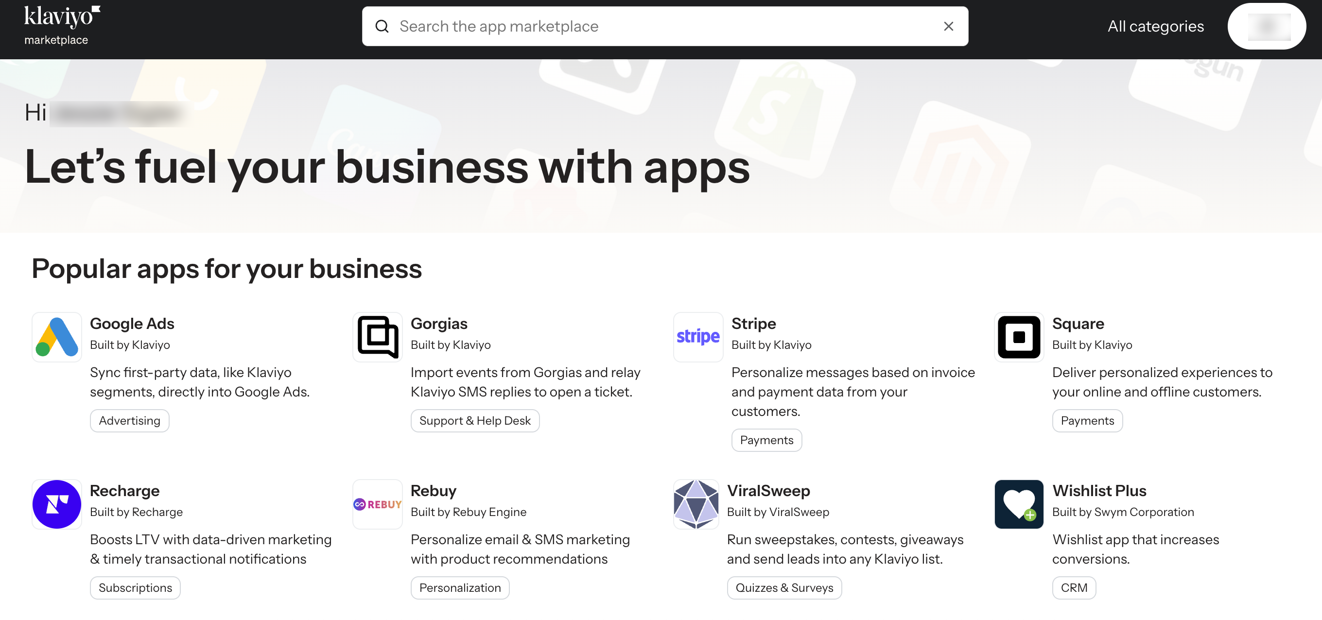 Nuestro mercado de aplicaciones contiene aplicaciones creadas por Klaviyo y aplicaciones seleccionadas creadas por nuestro ecosistema. Si no encuentra la aplicación que busca, póngase en contacto directamente con el proveedor del software.